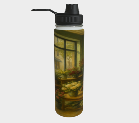 Cette bouteille illustre l’intérieur lumineux d’une boutique de fleurs contemporaine : tables en bois, pots de terre cuite, fleurs éclatantes et lumière douce filtrée par de grandes fenêtres. C’est un hommage aux espaces inspirants, à la créativité florale et à l’élégance naturelle. Un accessoire à la fois utile, beau et apaisant.