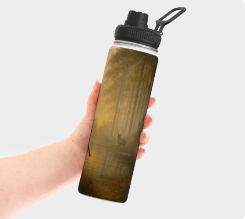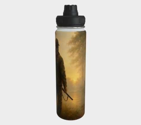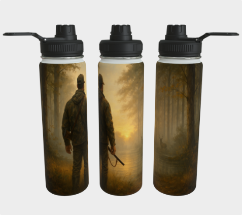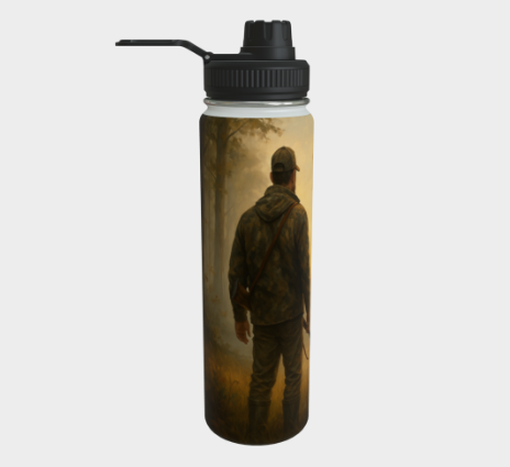 Avec son illustration réaliste d’un papa chasseur dans une forêt brumeuse au lever du jour, cette bouteille incarne le calme, la vigilance et le respect de la nature. Solide, pratique et marquée d’un visuel inspirant, elle accompagne aussi bien les longues traques que les moments de détente au camp.