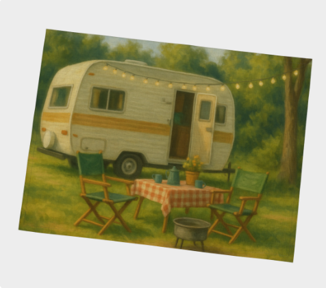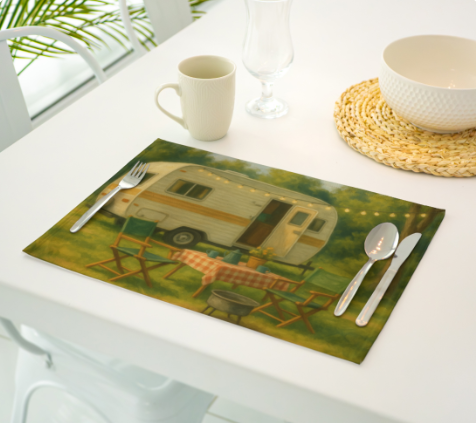 Ce napperon présente une scène champêtre et bucolique : une roulotte rétro posée au cœur d’un petit boisé, une table à carreaux, des chaises pliantes, un feu prêt à être allumé… et une guirlande lumineuse suspendue dans les arbres. Chaque détail est peint avec une touche réaliste et douce, évoquant les soirées paisibles autour d’un feu de camp.