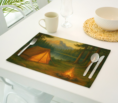 Transforme ta table en coin nature avec ce napperon au visuel chaleureux inspiré d’une scène de camping en forêt, au bord d’un lac, sous les derniers rayons du jour. La tente illuminée, le feu de camp et les montagnes en arrière-plan créent une ambiance apaisante et authentique qui donne envie de prendre une pause, même à l’heure du souper.