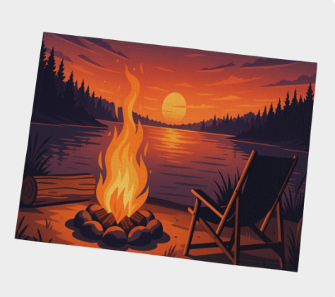 Ce napperon met en scène un feu de camp crépitant à la tombée du jour. Une chaise pliante repose sur la rive, face à un lac tranquille entouré d’arbres, baigné par la lumière dorée du coucher de soleil. Un décor à la fois réconfortant et inspirant, parfait pour accompagner tes repas d’une touche de nature et de détente.