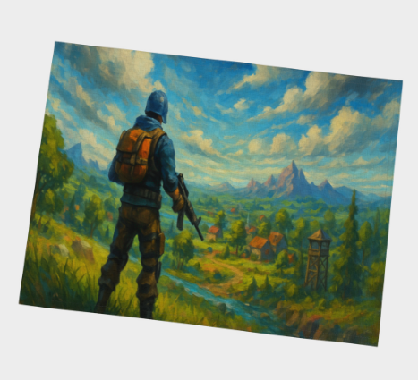 Ce napperon représente un personnage équipé pour le combat, observant un vaste paysage coloré de collines, montagnes et petites maisons, sous un ciel bleu rempli de nuages. L’ambiance est à la fois stratégique et pleine de découvertes, évoquant parfaitement l’esprit des jeux de survie et de construction.