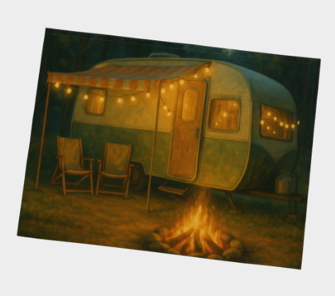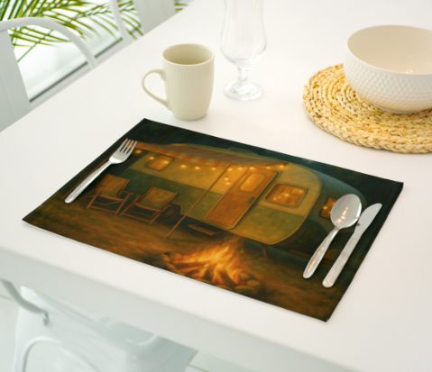 Un doux moment de camping comme on les aime, immortalisé sur un napperon. Ce visuel peint rappelle les belles soirées d’été à relaxer autour du feu, une boisson chaude à la main et les guirlandes lumineuses de la roulotte qui brillent doucement. C’est un napperon qui respire la détente, la nostalgie et la joie de décrocher du quotidien.